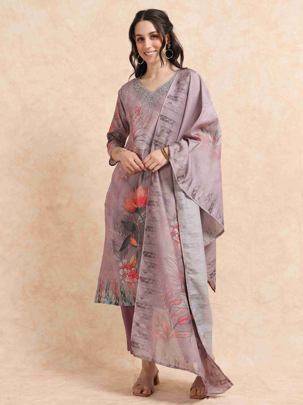 Step into elegance with this beautiful lavender A-line kurti set that combines traditional artistry with modern design. Crafted from soft, breathable fabric, the kurti features delicate digital prints enhanced with intricate hand embroidery, giving it a rich, handcrafted appeal.