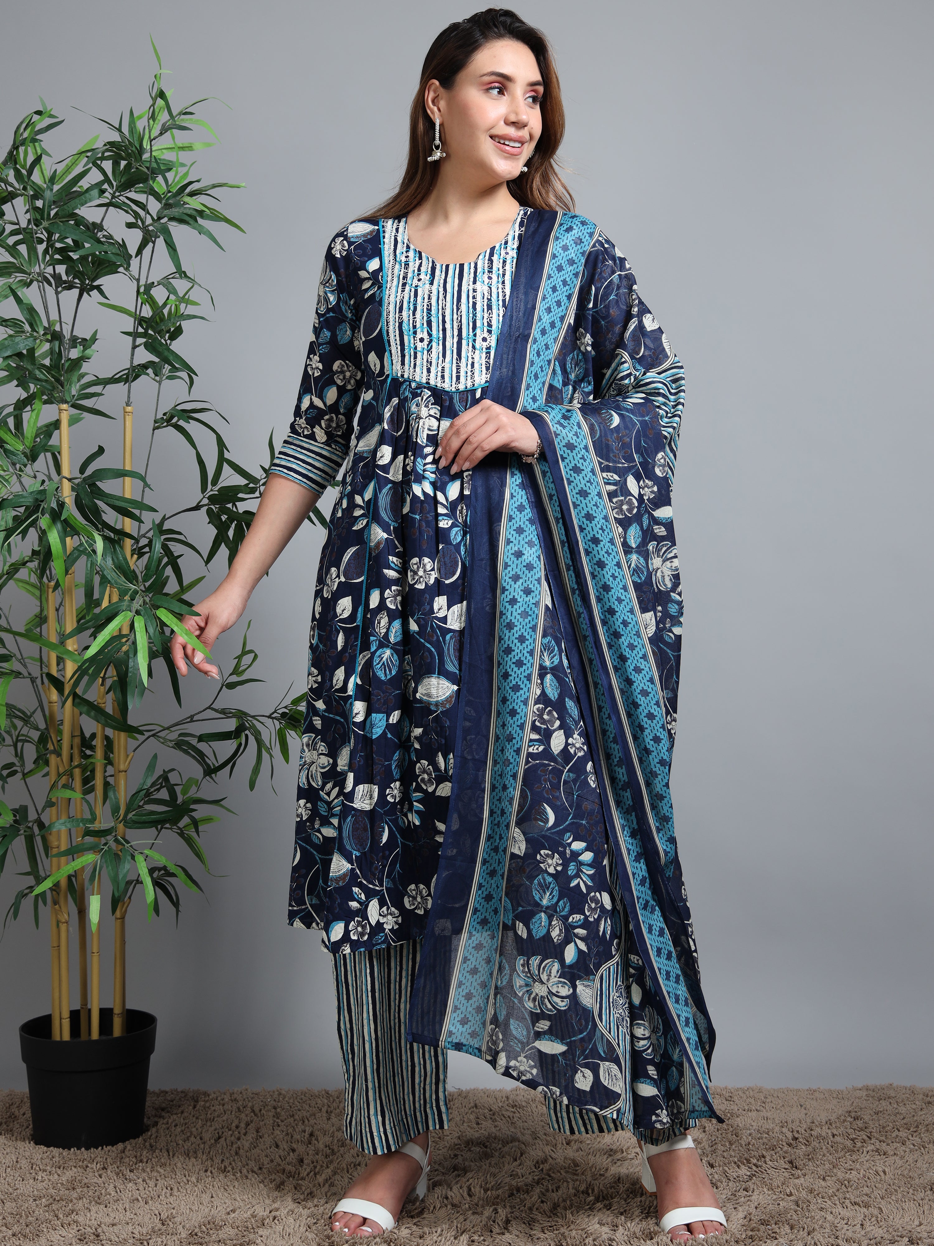Designed in soft, breathable cotton, this navy blue floral kurti set offers a perfect blend of elegance and everyday comfort. The graceful floral print paired with a beautifully detailed yoke adds a refined touch, while the relaxed silhouette ensures ease of wear. Complete with matching pants and a coordinated dupatta, this set is ideal for office wear, casual outings, and day-to-evening styling.